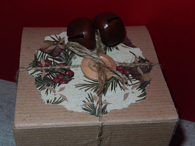 Thinking of small gifts for the grandson’s teachers (that they will actually use) can be a challenge. But who couldn’t use some cute winter printed tissues and some hand sanitizer? I used my Cricut and the Sweet Tooth Boxes cartridge to make the boxes out of Kraft paper. I used the Kreaxions Star Stencil and the Kreaxions 4 in 1 punch # 915 with the A insert to make the doilies. Adding the doilies, some twine, a button and some jingle bells turned these plain little boxes into cute Christmas gift boxes.